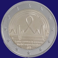 Beschrijving van het ontwerp: het ontwerp bevat in het midden een lint, dat wordt gebruikt als universeel symbool om betrokkenheid te tonen bij de strijd tegen kanker. Het krullende lint strekt zich verder uit naar beide kanten, wat symbool staat voor de weergave van een hartslag op een monitor en zo een uitdrukking is van leven en vitaliteit. Bovenaan zijn drie lijnen zichtbaar die verwijzen naar een regenboog (een symbool voor hoop en troost). Op de onderste lijn zijn de landcode BE en het jaartal 2024 toegevoegd. Onderaan het stuk staan opschriften in het Frans en het Nederlands: “Lutte contre le cancer” – “Strijd tegen kanker”. De initialen van de ontwerpster Iris Bruijns bevinden zich links boven de opschriften. Aangezien de Koninklijke Nederlandse Munt de munt zal slaan, bevindt zich helemaal aan de onderkant het muntteken van Utrecht, een mercuriusstaf, naast het Belgische muntmeesterteken, een aster voor een erlenmeyer. Langs de buitenrand van de munt zijn de twaalf sterren van de Europese vlag afgebeeld.