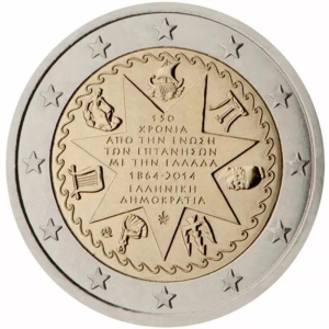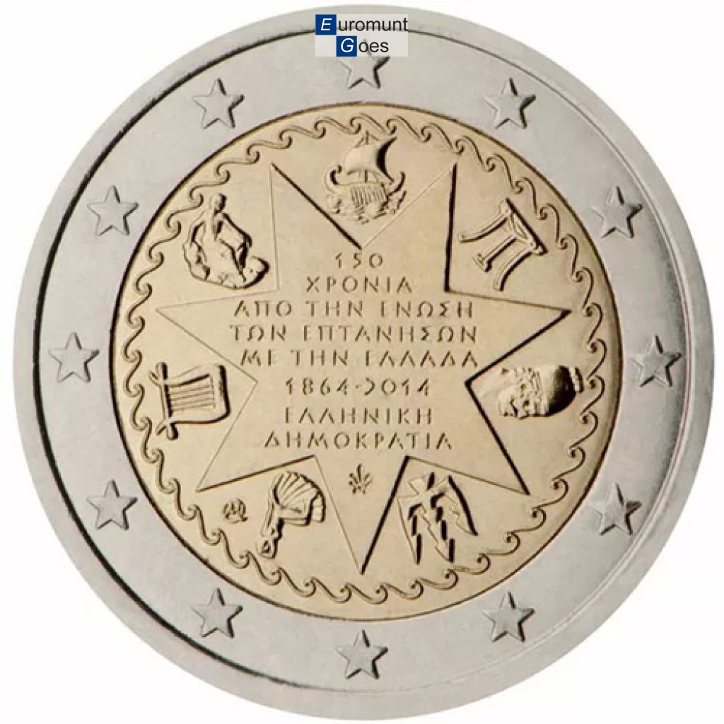 Beschrijving van het ontwerp: in het binnenste gedeelte van de munt is een zevenpuntige ster afgebeeld waarop in het Grieks het volgende is vermeld: „150 JAAR SINDS DE VERENIGING VAN DE IONISCHE EILANDEN (EPTÁNISA) MET GRIEKENLAND 1864-2014”, de naam van de uitgevende staat „HELLEENSE REPUBLIEK” en het muntteken van de Griekse Nationale Munt. In de ruimten tussen de punten van de ster staan de symbolen van de Ionische Eilanden. Het gehele ontwerp is omgeven door een decoratief gestileerd golfmotief. Langs de buitenrand van de munt zijn de twaalf sterren van de Europese Unie afgebeeld.