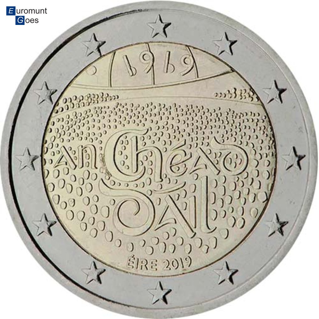 Beschrijving van het ontwerp: het ontwerp stelt de eerste zitting voor van het Dáil Éireann in de Round Room. Het bestuur van de Ierse natie ging op 21 januari van start en de zitting werd volledig in de Ierse taal gevoerd om op de symbolische aard van de bijeenkomst te wijzen. De grote Round Room van het Mansion House vormt een boog boven de verzamelde leden van het eerste gekozen Dáil. De woorden “An Chéad Dáil” (het eerste Dáil) in het midden van het ontwerp en het jaartal “1919” bovenaan zijn gezet in een traditioneel lettertype, de unciaal. Onderaan staan de naam van het uitgevende land en het jaar van uitgifte “ÉIRE 2019”. Langs de buitenrand van de munt staan de twaalf sterren van de Europese Unie afgebeeld.