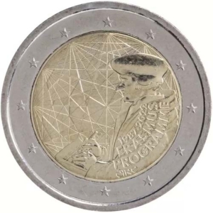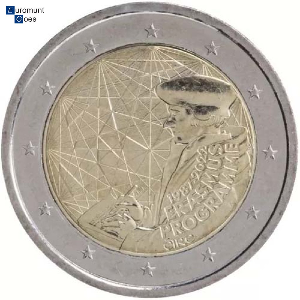 Beschrijving van het ontwerp: een combinatie van twee belangrijke elementen van het Erasmus-programma: de geestelijk vader, Erasmus zelf, en een allegorie van zijn invloed op Europa. Voor het eerste element staat een van de bekendste afbeeldingen van Erasmus symbool. Het tweede wordt gesymboliseerd door bakens die stralen naar elkaar zenden die als een netwerk over de munt liggen. Daarmee worden de talrijke intellectuele en menselijke uitwisselingen tussen de Europese studenten verbeeld. Sommige verbindingen vormen sterren, voortkomend uit de synergie tussen landen, als verwijzing naar Europa. Het getal 35, als weergave voor het 35-jarige bestaan van het Erasmus-programma, komt in een hedendaagse grafische stijl uit de sterren naar voren. Langs de buitenrand zijn de twaalf sterren van de Europese vlag afgebeeld.