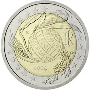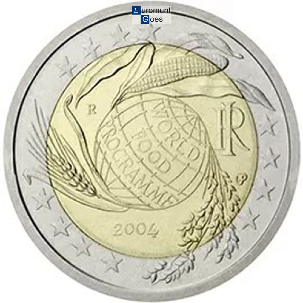 Beschrijving van het ontwerp: in het midden staat de afbeelding van een naar rechts gekantelde wereldbol met het opschrift „WORLD FOOD PROGRAMME”. Een korenaar, een maïskolf en een rijstaar, de drie graansoorten die de essentiële voedselbronnen van de wereld voorstellen, komen van achter de wereldbol te voorschijn. Rechts van de wereldbol staat een „I” bovenop een „R”, het monogram van „Repubblica Italiana”, met daaronder een kleinere combinatie van de letters „U” en „P”, de initialen van de graveur, Uliana Pernazza. Bovenaan links van de wereldbol staat het muntteken „R” en onder de wereldbol het jaartal, „2004”. Langs de buitenrand van de munt zijn de twaalf sterren van de Europese Unie afgebeeld.