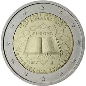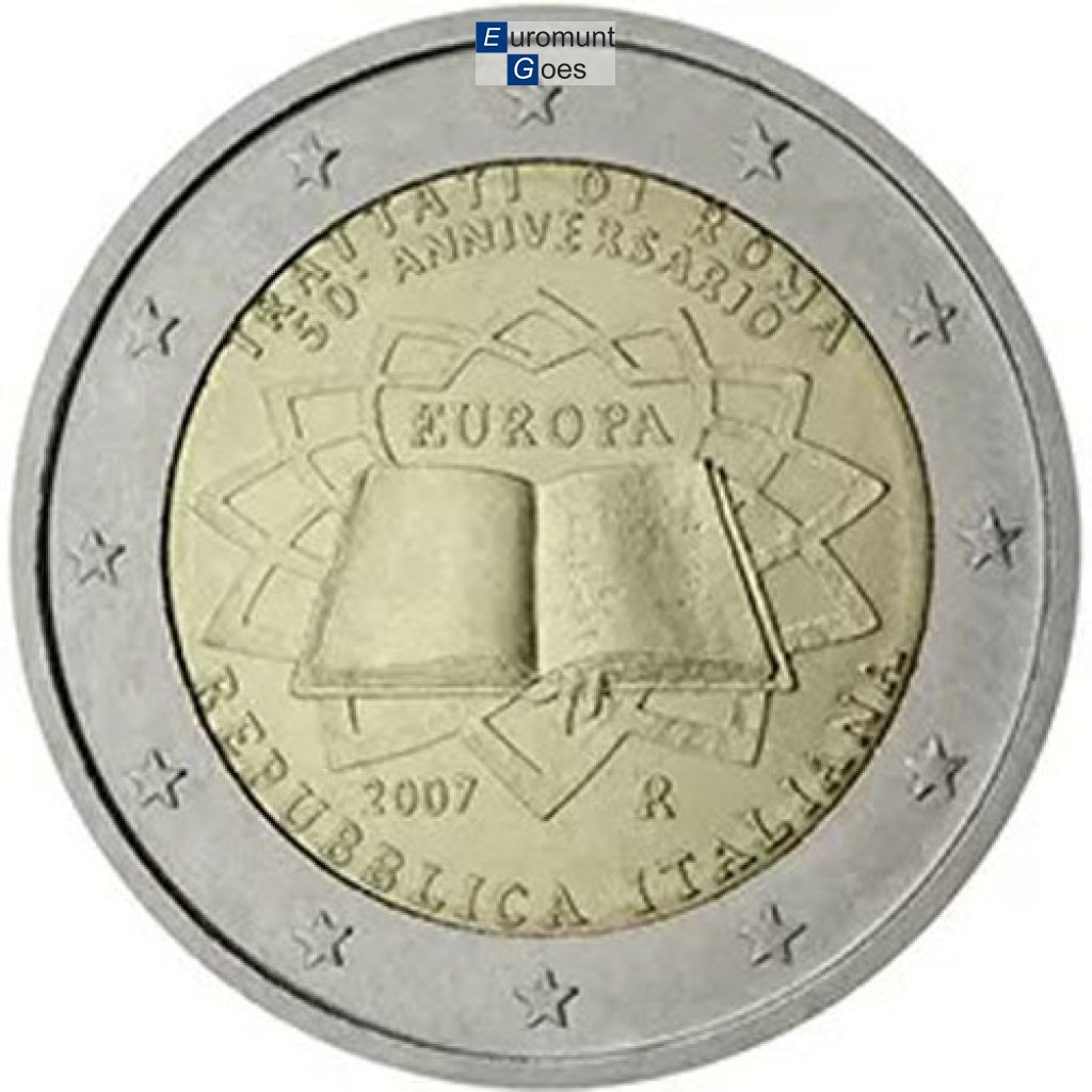 Beschrijving van het ontwerp: De munt toont het document met het Verdrag ondertekend door de zes oprichtingslanden tegen een achtergrond die herinnert aan de bestrating van de Piazza del Campidoglio in Rome (ontworpen door Michelangelo), waar het Verdrag op 25 maart 1957 werd ondertekend. De opschriften “Verdrag van Rome 50 jaar”, “EUROPA” en de naam van het uitgevende land zijn weergegeven in de respectieve talen van het eurogebied of in het Latijn. De opschriften verschillen dus van land tot land, maar de afbeelding is hetzelfde. Bij het Verdrag van Rome werd de Europese Economische Gemeenschap opgericht, wat uiteindelijk heeft geleid tot de invoering van de euro in 1999 en de eurobankbiljetten en euromunten in 2002. De verjaardag zal worden gevierd op 25 maart 2007. De landen van het eurogebied hebben de gelegenheid luister bijgezet door gezamenlijk deze herdenkingsmunt uit te geven. Het ontwerp is geselecteerd na een wedstrijd die door de Europese munthuizen is gehouden. Langs de buitenrand van de munt zijn de twaalf sterren van de Europese Unie afgebeeld.