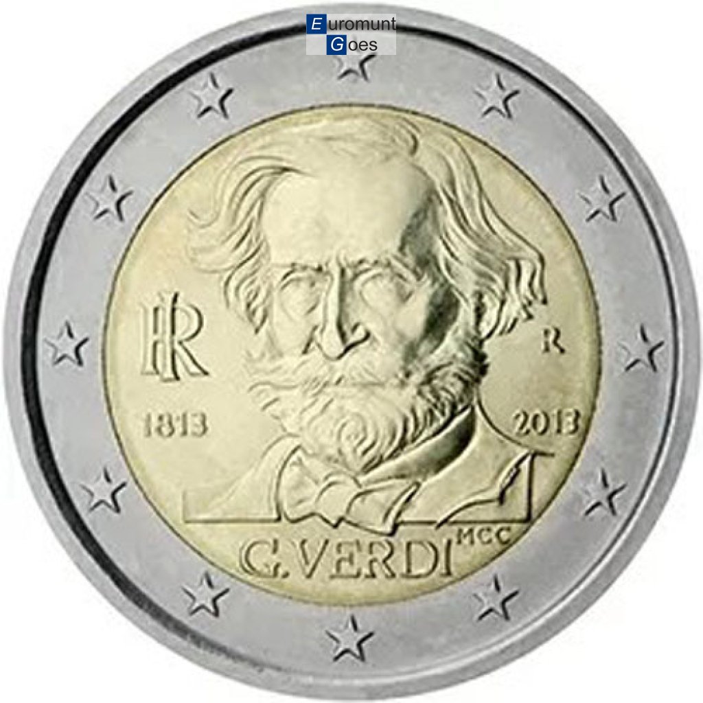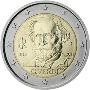 Beschrijving van het ontwerp: het ontwerp toont het borstbeeld van Giuseppe VERDI, van links in driekwartprofiel gezien, met aan de linkerzijde de letter I bovenop de R (het monogram van de Italiaanse Republiek) en daaronder het jaartal 1813 en aan de rechterzijde een R (het monogram van de Romeinse Munt) en daaronder het jaartal 2013.In de afsnede MCC (monogram van ontwerpster Maria Carmela COLANERI) en G. VERDI. Langs de buitenrand van de munt zijn de twaalf sterren van de Europese Unie afgebeeld.