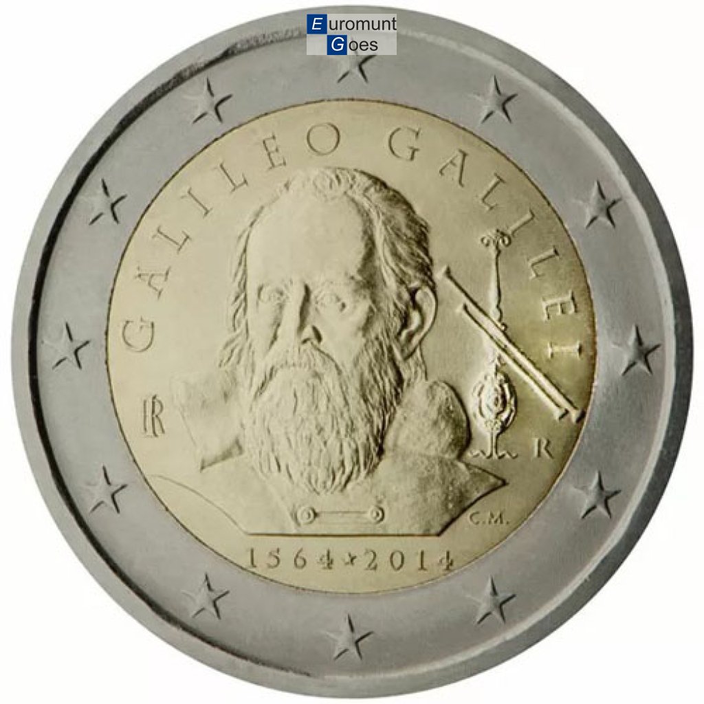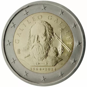 Beschrijving van het ontwerp: de afbeelding stelt het hoofd van Galileo Galilei voor zoals dat op het schil derij van Justus Sustermans uit 1636 is weergegeven (Florence, Galleria degli Uffizi). Aan de bovenzijde wordt daarrond „GALILEO GALILEI” vermeld. Rechts ervan staan de letter R (monogram van de Romeinse Munt), een astronomische telescoop en „C.M.” (monogram van de ontwerpster, Claudia Momoni), links ervan, elkaar overlappend, de letters „RI”, het monogram van de Italiaanse Republiek. In de afsnede staat 1564-2014. Langs de buitenrand van de munt zijn de twaalf sterren van de Europese Unie afgebeeld.