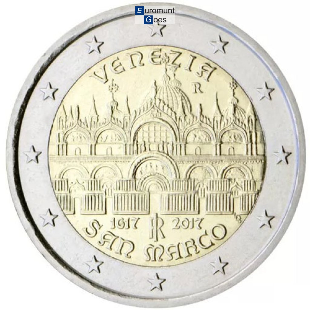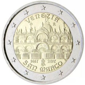 Beschrijving van het ontwerp: voorgevel van de basiliek van San Marco in Venetië; in de afsnede de jaartallen "1617” en "2017” (respectievelijk het jaar van de voltooiing van de basiliek en het jaar van uitgifte van de munt) aan weerszijden van het logo van de Italiaanse Republiek "RI”; onderaan het opschrift "SAN MARCO”; rechts "LDS”, de initialen van de ontwerpster Luciana De Simoni; bovenaan het opschrift "VENEZIA” en het muntteken van de Munt van Rome "R”. Langs de buitenrand van de munt zijn de twaalf sterren van de Europese Unie afgebeeld.