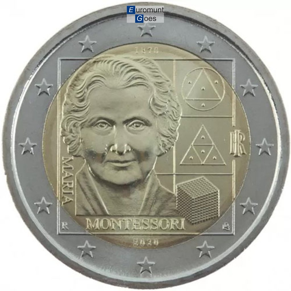 Beschrijving van het ontwerp: een portret van Maria Montessori in een geometrische compositie met enkele didactische elementen ontleend aan haar onderwijssysteem. Rechts in het ontwerp “RI”, het acroniem van de Italiaanse Republiek; links “R”, het muntteken van het munthuis van Rome; rechts “LDS”, de initialen van de ontwerper Luciana De Simoni; bovenaan het jaartal “1870”, het geboortejaar van de Italiaanse pedagoge; onderaan het jaartal “2020”, het jaar van uitgifte van de munt; rondom het portret de inscriptie “MARIA MONTESSORI”. Langs de buitenrand van de munt staan de twaalf sterren van de Europese vlag afgebeeld.