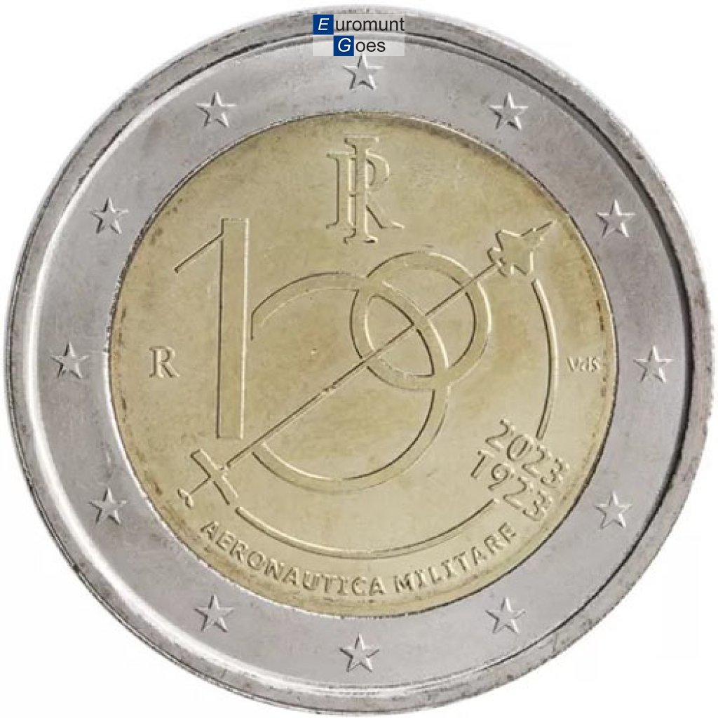 Beschrijving van het ontwerp: de afbeelding toont het logo van het honderdjarig bestaan van de luchtmacht. Links staat de letter “R”, het muntteken van het munthuis van Rome; bovenaan “RI”, de afkorting van de Italiaanse Republiek; onderaan het opschrift “AERONAUTICA MILITARE” in boogvorm; en rechts “VdS”, de initialen van de ontwerper Valerio De Seta. Langs de buitenrand van de munt zijn de twaalf sterren van de Europese vlag afgebeeld.