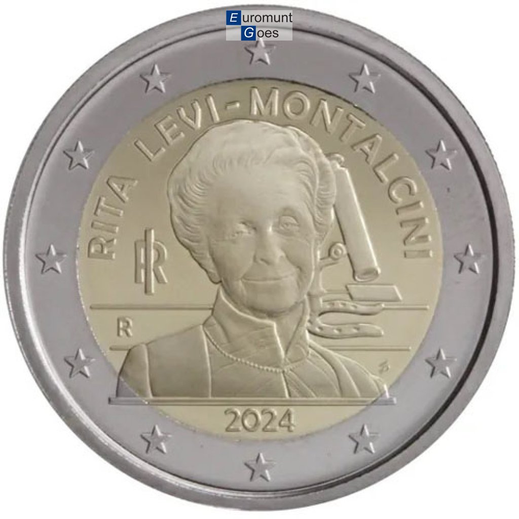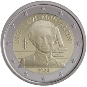Beschrijving van het ontwerp: het ontwerp toont op de voorgrond het portret van Rita Levi-Montalcini in half profiel, dat is geïnspireerd op de foto’s van Manuela Fabbri. Op de achtergrond staat een microscoop die gebaseerd is op een medaille die ontworpen werd door de broer van deze gerenommeerde wetenschapper, Gino Levi-Montalcini. De onderkant van de microscoop is hoefijzervormig en verwijst naar haar succes als Nobelprijswinnaar voor geneeskunde van 1986. Onderaan staat “RITA LEVI-MONTALCINI” in een boog, links “RI” het acroniem voor Italië en “R” voor het munthuis van Rome, eronder “2024”, het jaar van afgifte, en rechts “SP”, de initialen van de ontwerpster Silvia Petrassi. Langs de buitenrand van de munt zijn de twaalf sterren van de Europese vlag afgebeeld.