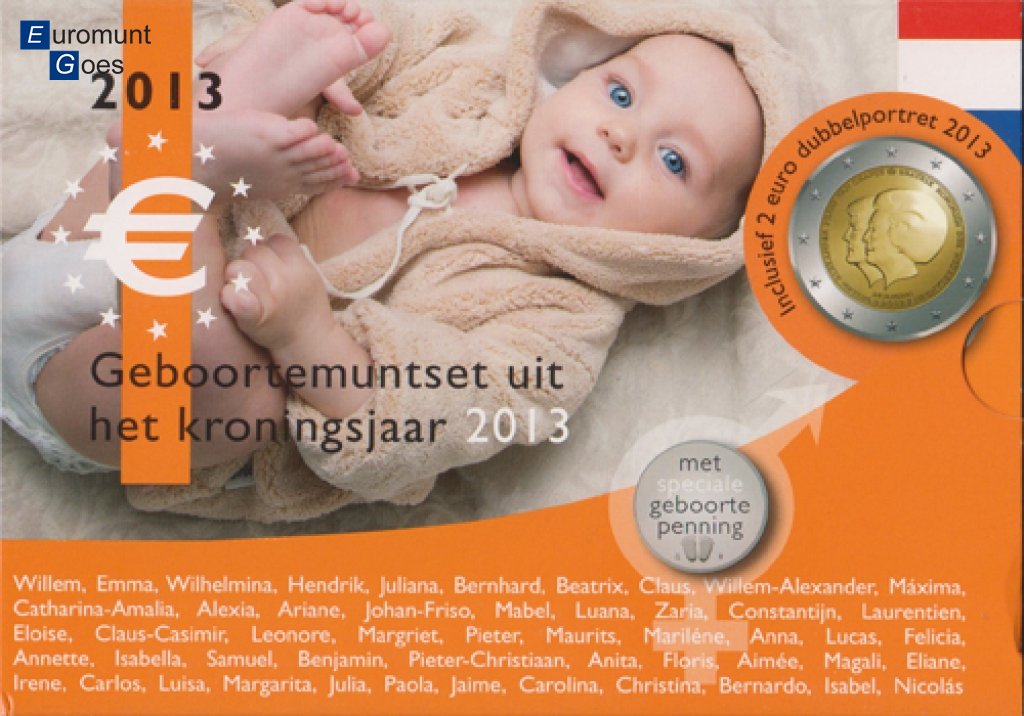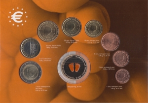 Deze set bevat in plaats van de gewone 2 euro een 2 euro "dubbelportret en een gekleurde babypenning, waarin een inscriptie gegraveerd kan worden (niet door ons). Bovendien is er aan de binnenkant van de set ruimte voor het vermelden van de naam van de baby, geboortedatum, de naam van de gever, en voor een foto.