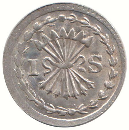 Kz.: Binnen een lauwerkrans een bundel van zeven pijlen; gesplitste waardeaanduiding ter weerszijden