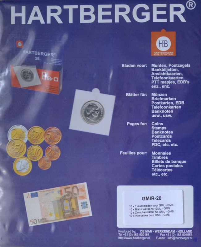 Hartberger GMI20R, tussenbladen ivoorwit (24,5 x 28,5 cm) met opdruk 20 vakken. Passend in de GML en GMS banden.