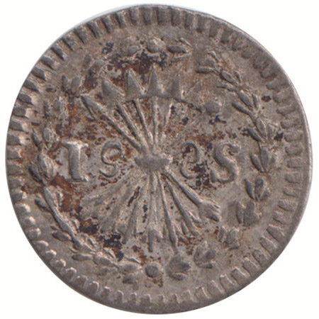 Kz.: Binnen een lauwerkrans een pijlenbundel; gesplitst waardeaanduiding ter weerszijden