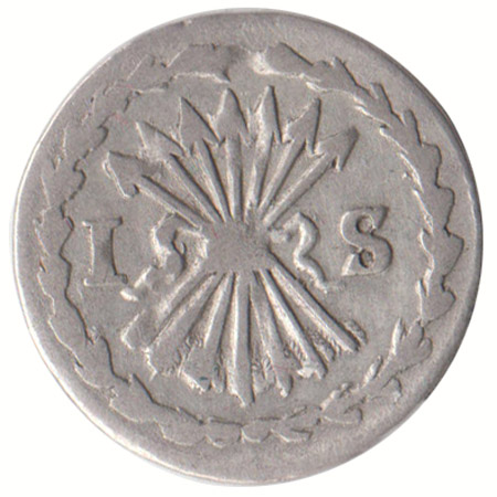 Kz.: Binnen een lauwerkrans een pijlenbundel; gesplitst waardeaanduiding ter weerszijden