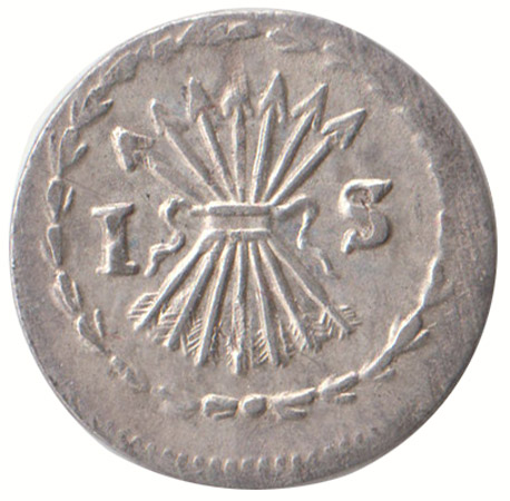 Kz.: Binnen een lauwerkrans een pijlenbundel; gesplitst waardeaanduiding ter weerszijden