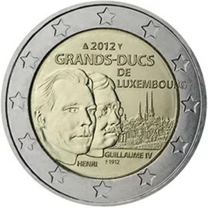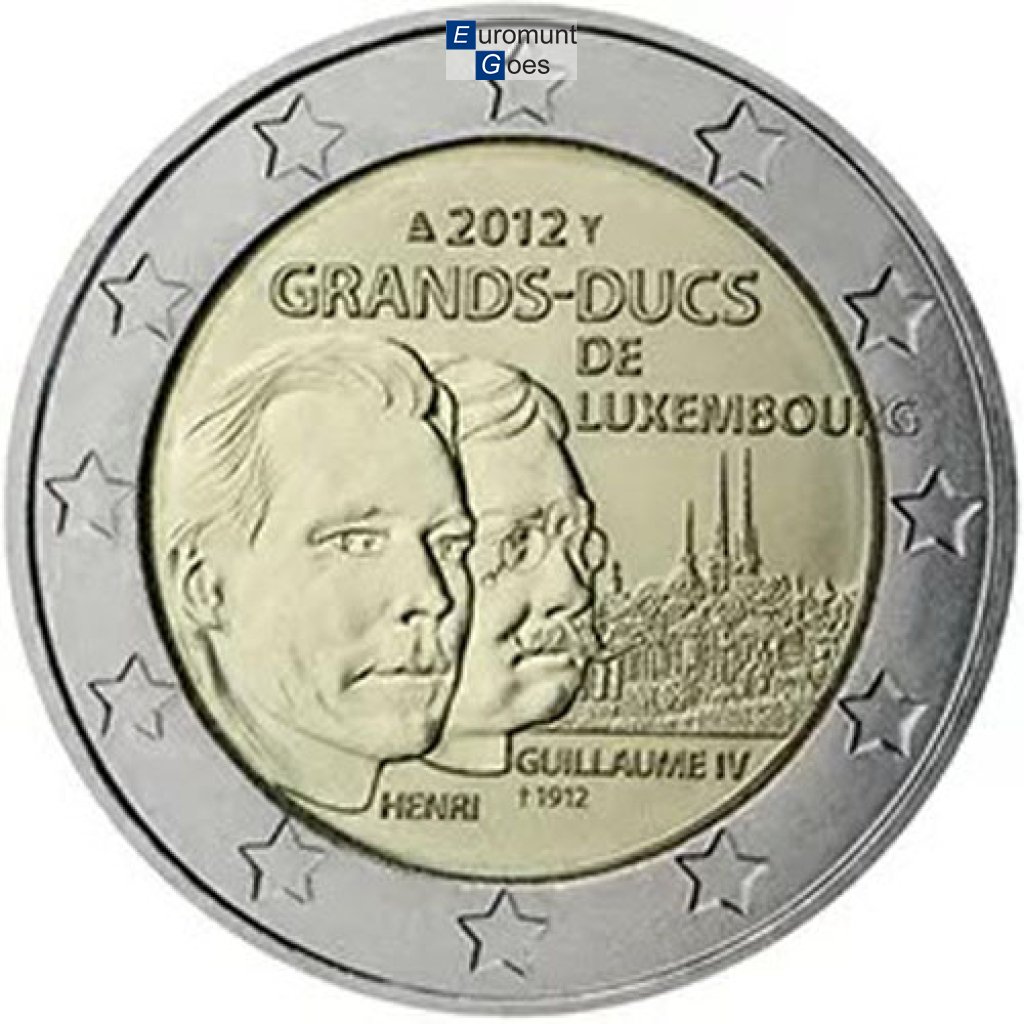 Beschrijving van het ontwerp: op het binnendeel van de munt is links het portret van Zijne Koninklijke Hoogheid groothertog Hendrik afgebeeld vóór dat van zijn overgrootvader, groothertog Willem IV, beide naar rechts, met onder hun portretten hun namen “HENRI” en “GUILLAUME IV † 1912”. Boven aan de binnenrand staat “2012”, met links het muntteken (de staf van Mercurius), rechts het muntmeesterteken (een zeilboot) en eronder de woorden “GRANDS-DUCS DE LUXEMBOURG”. Op de achtergrond is de stad Luxemburg te zien. Langs de buitenrand van de munt zijn de twaalf sterren van de Europese Unie afgebeeld.