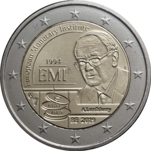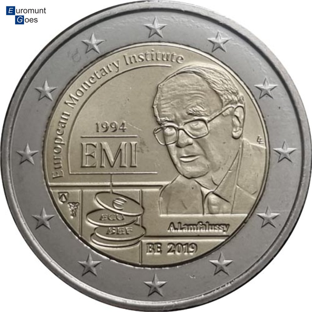 Beschrijving van het ontwerp: in het binnenste deel van het stuk is aan de rechterzijde het portret te zien van Alexandre Lamfalussy, de eerste president van het EMI, met daaronder zijn naam. Aan de linkerzijde staat de afkorting “EMI” centraal, met erboven het jaar “1994”, dat verwijst naar de datum van de oprichting van het instituut en de aanwijzing van Lamfalussy als eerste president. Onder “EMI” zijn verschillende op elkaar vallende munten afgebeeld met, van boven naar beneden, het opschrift €, “ECU” en “BEF”. Aangezien dit een Belgische uitgifte is, is gekozen voor “BEF”, de afkorting van de vroegere nationale munteenheid. Die voorstelling symboliseert de overgang van de nationale valuta’s naar een Europese eenheidsmunt, de euro, aangezien het EMI zich vooral richtte op de oprichting van het Europees Stelsel van centrale banken, met inbegrip van de ECB en de nieuwe valuta. Op de linkerbovenzijde van de munt staat het opschrift “European Monetary Institute”. Aangezien de Koninklijke Nederlandse Munt de munt zal slaan, bevindt zich links het muntteken van Utrecht, een mercuriusstaf, met daaronder het Belgische muntmeesterteken, het wapenschild van de gemeente Herzele. De landcode “BE” en het jaartal “2019” staan onderaan. De initialen “LL” van de ontwerper van het muntstuk, Luc Luycx, staan rechts. Langs de buitenrand van de munt zijn de twaalf sterren van de Europese Unie afgebeeld.