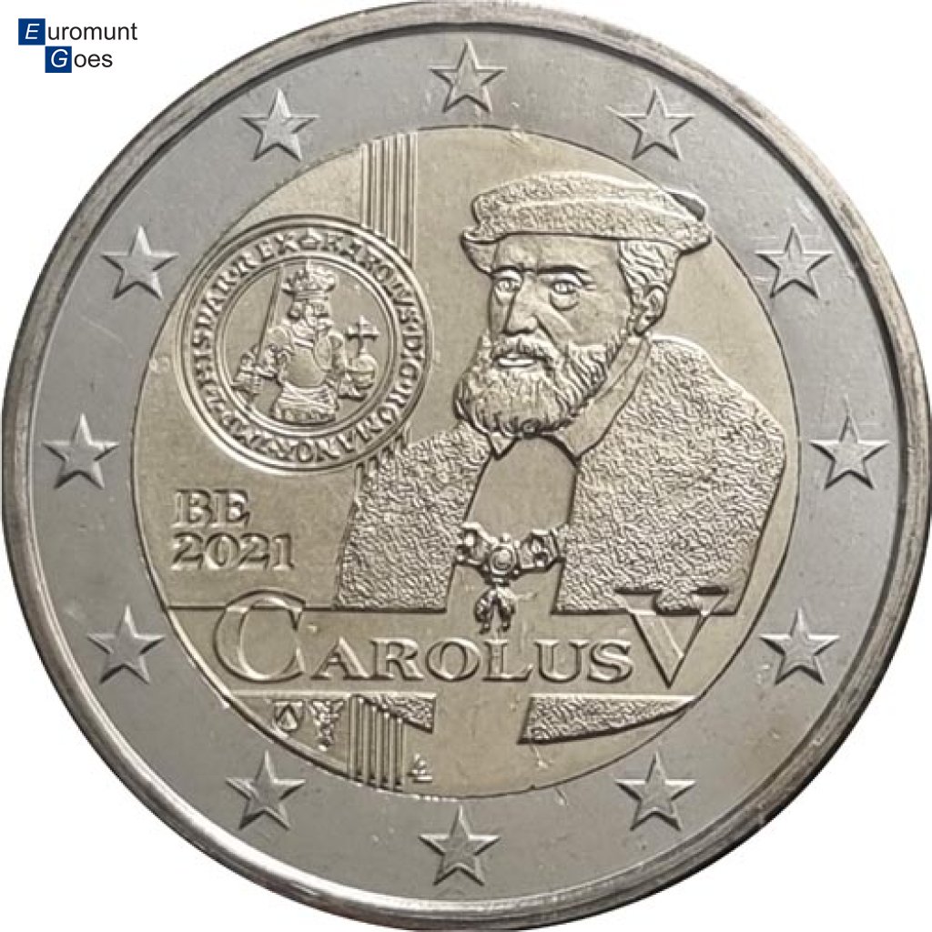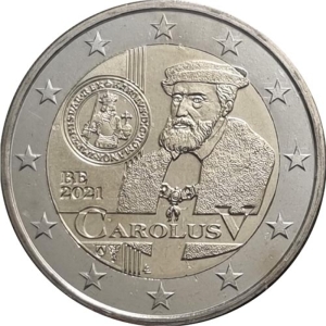 Beschrijving van het ontwerp: op het binnenste gedeelte van de nationale zijde van de munt wordt het portret van keizer Karel V afgebeeld, samen met de tekst “Carolus V”. Links daarvan staat de 500 jaar oude gouden carolusgulden, die in omloop werd gebracht na de uitgifte van een tweede serie munten tijdens het bewind van keizer Karel V. Aangezien de Koninklijke Nederlandse Munt de munt zal slaan, bevindt zich onderaan het muntteken van Utrecht, een mercuriusstaf, samen met het Belgische muntmeesterteken, het wapen van de gemeente Herzele. Op de munt staan ook de initialen LL, een verwijzing naar de ontwerper van de munt, de heer Luc Luycx. De landcode BE en het jaartal 2021 staan links. Langs de buitenrand van de munt zijn de twaalf sterren van de Europese vlag afgebeeld.