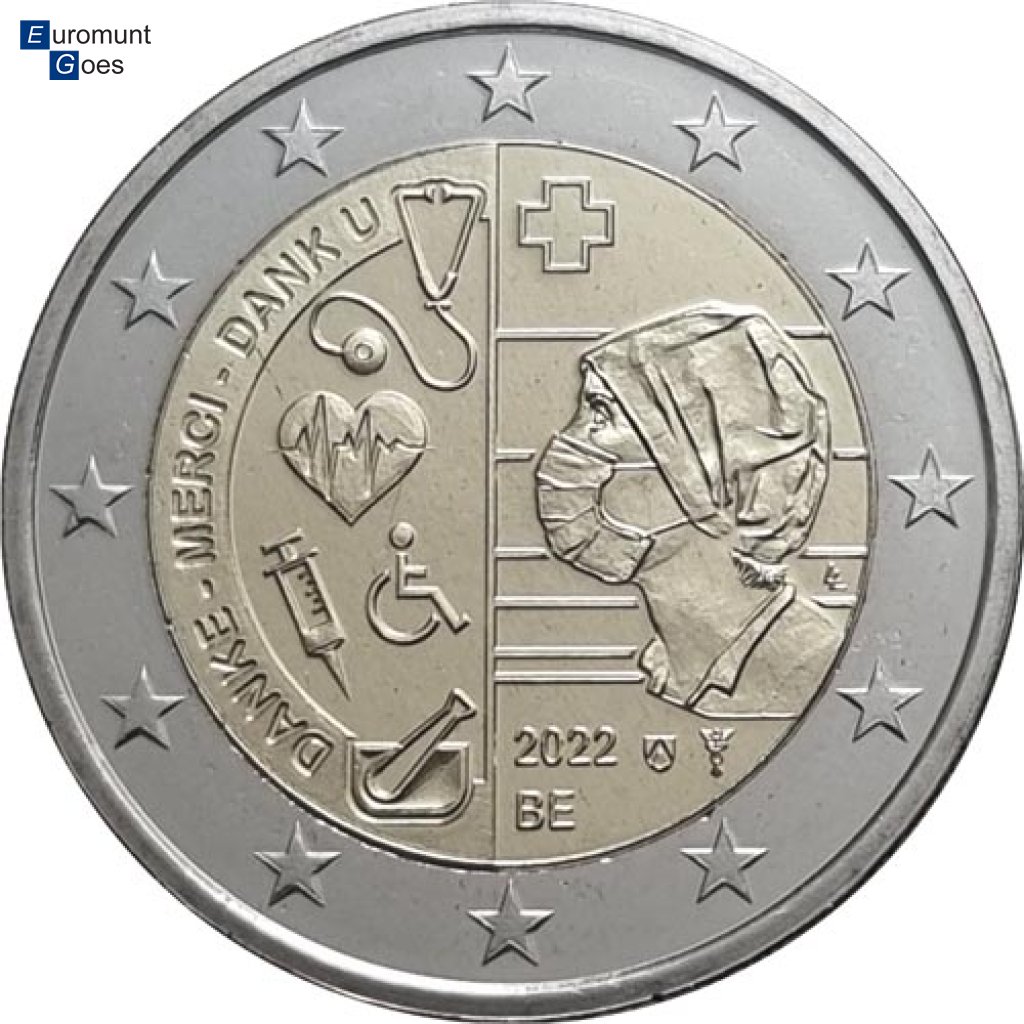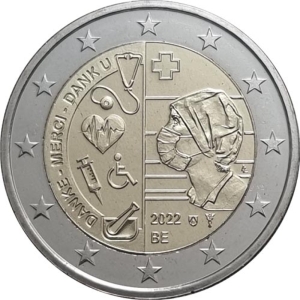 Beschrijving van het ontwerp: centraal in het midden van de munt staat het zorgpersoneel. Links daarvan bevindt zich de inscriptie “Danke – Merci – Dank u”, met ernaast diverse pictogrammen die verwijzen naar de zorgsector. Van boven naar beneden zijn een kruis, een stethoscoop, een hart, een injectiespuit, een rolstoel en een chemisch mengsel afgebeeld. Helemaal rechts staan de initialen van de ontwerper Luc Luycx. Aangezien de Koninklijke Nederlandse Munt de munt slaat, bevindt zich onderaan het muntteken van Utrecht, een mercuriusstaf, samen met het Belgische muntmeesterteken, het wapenschild van de gemeente Herzele, alsook de landcode BE en het jaartal 2022. Langs de buitenrand van de munt zijn de twaalf sterren van de Europese vlag afgebeeld.