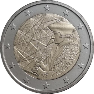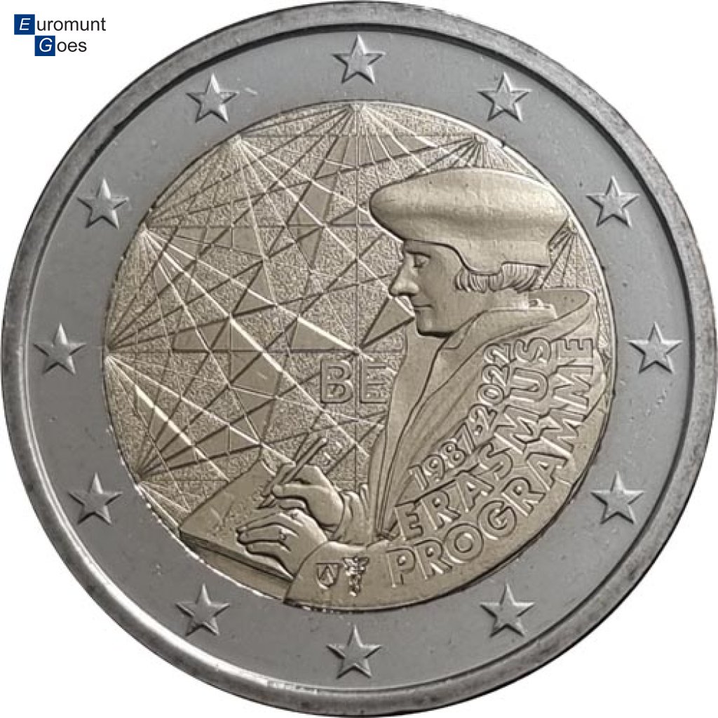 Beschrijving van het ontwerp: een combinatie van twee belangrijke elementen van het Erasmus-programma: de geestelijk vader, Erasmus zelf, en een allegorie van zijn invloed op Europa. Voor het eerste element staat een van de bekendste afbeeldingen van Erasmus symbool. Het tweede wordt gesymboliseerd door bakens die stralen naar elkaar zenden die als een netwerk over de munt liggen. Daarmee worden de talrijke intellectuele en menselijke uitwisselingen tussen de Europese studenten verbeeld. Sommige verbindingen vormen sterren, voortkomend uit de synergie tussen landen, als verwijzing naar Europa. Het getal 35, als weergave voor het 35-jarige bestaan van het Erasmus-programma, komt in een hedendaagse grafische stijl uit de sterren naar voren. Langs de buitenrand van de munt zijn de twaalf sterren van de Europese vlag afgebeeld.