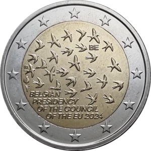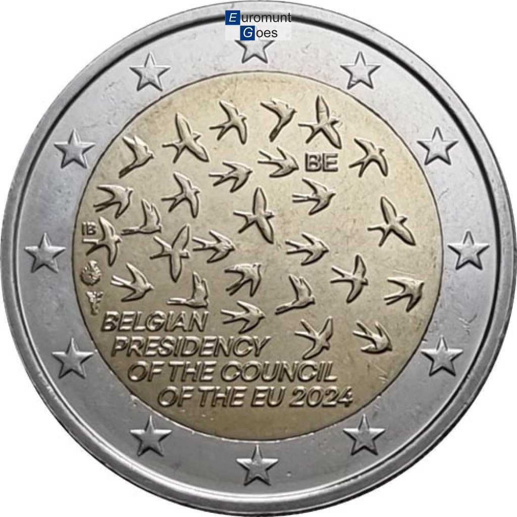 Beschrijving van het ontwerp: op de munt staat een zwerm vogels (zwaluwen) die de werking van de EU symboliseert. Zij bewegen zich voort als een groep, maar elk lid krijgt wel zijn eigen bewegingsvrijheid. Dit creëert een complexe en dynamische eenheid. De zwerm staat dus in de eerste plaats voor samenhorigheid. Tijdens de vlucht van de zwaluwen is er altijd één die de leiding neemt en de rest van de groep meetrekt. In de eerste helft van 2024 vervult België deze rol. De 27 vogels symboliseren ook het totale aantal EU-lidstaten. De landcode “BE” bevindt zich rechtsboven tussen de vogels. Onder de zwerm vogels staat op de onderste vrije ruimte de beschrijving “BELGIAN PRESIDENCY OF THE COUNCIL OF THE EU 2024” (Belgische voorzitterschap van de Raad van de EU 2024). Uiterst links staan de initialen van de ontwerpster, Iris Bruijns. Aangezien de Koninklijke Nederlandse Munt de munt zal slaan, bevindt zich uiterst links het muntteken van Utrecht, een mercuriusstaf. Daarboven staat het Belgische muntmeesterteken, een aster voor een erlenmeyer. Langs de buitenrand van de munt zijn de twaalf sterren van de Europese vlag afgebeeld.