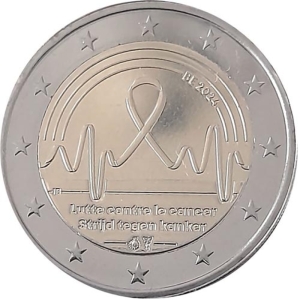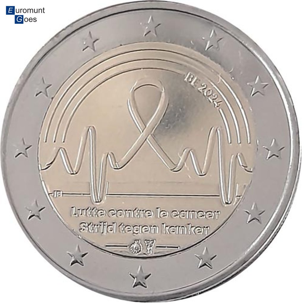 Beschrijving van het ontwerp: het ontwerp bevat in het midden een lint, dat wordt gebruikt als universeel symbool om betrokkenheid te tonen bij de strijd tegen kanker. Het krullende lint strekt zich verder uit naar beide kanten, wat symbool staat voor de weergave van een hartslag op een monitor en zo een uitdrukking is van leven en vitaliteit. Bovenaan zijn drie lijnen zichtbaar die verwijzen naar een regenboog (een symbool voor hoop en troost). Op de onderste lijn zijn de landcode BE en het jaartal 2024 toegevoegd. Onderaan het stuk staan opschriften in het Frans en het Nederlands: “Lutte contre le cancer” – “Strijd tegen kanker”. De initialen van de ontwerpster Iris Bruijns bevinden zich links boven de opschriften. Aangezien de Koninklijke Nederlandse Munt de munt zal slaan, bevindt zich helemaal aan de onderkant het muntteken van Utrecht, een mercuriusstaf, naast het Belgische muntmeesterteken, een aster voor een erlenmeyer. Langs de buitenrand van de munt zijn de twaalf sterren van de Europese vlag afgebeeld.