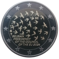 Beschrijving van het ontwerp: op de munt staat een zwerm vogels (zwaluwen) die de werking van de EU symboliseert. Zij bewegen zich voort als een groep, maar elk lid krijgt wel zijn eigen bewegingsvrijheid. Dit creëert een complexe en dynamische eenheid. De zwerm staat dus in de eerste plaats voor samenhorigheid. Tijdens de vlucht van de zwaluwen is er altijd één die de leiding neemt en de rest van de groep meetrekt. In de eerste helft van 2024 vervult België deze rol. De 27 vogels symboliseren ook het totale aantal EU-lidstaten. De landcode “BE” bevindt zich rechtsboven tussen de vogels. Onder de zwerm vogels staat op de onderste vrije ruimte de beschrijving “BELGIAN PRESIDENCY OF THE COUNCIL OF THE EU 2024” (Belgische voorzitterschap van de Raad van de EU 2024). Uiterst links staan de initialen van de ontwerpster, Iris Bruijns. Aangezien de Koninklijke Nederlandse Munt de munt zal slaan, bevindt zich uiterst links het muntteken van Utrecht, een mercuriusstaf. Daarboven staat het Belgische muntmeesterteken, een aster voor een erlenmeyer. Langs de buitenrand van de munt zijn de twaalf sterren van de Europese vlag afgebeeld.