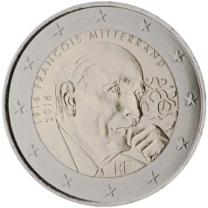 Beschrijving van het ontwerp: het ontwerp laat een zijaanzicht zien van een in gedachten verzonken François Mitterrand. Rechts daarvan is zijn persoonlijke symbool afgebeeld:de samenvoeging van een eik en een olijfboom. Bovenaan worden zijn geboortejaar en het jaar van zijn honderdste geboortedag („1916” en „2016”) vermeld, en zijn naam. Onderaan staat de aanduiding van het uitgevende land: Langs de buitenrand van de munt zijn de twaalf sterren van de Europese Unie afgebeeld.