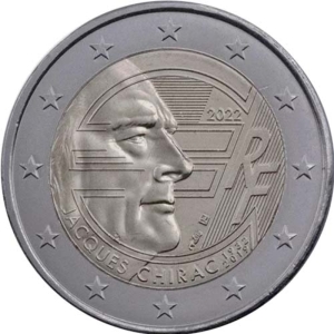 Beschrijving van het ontwerp: Jacques Chirac, president van de Franse Republiek gedurende twee ambtstermijnen, was een belangrijke architect van de Europese eenwording. Hij was president bij de invoering van de euro in 2002, begin dit jaar 20 jaar geleden. Het ontwerp toont een profiel van president Jacques Chirac die in de toekomst blikt. Hij is omgeven door verschillende symbolen die zijn presidentschap kenmerken: een eurologo, als teken van zijn betrokkenheid bij de invoering van de euro en zijn Europese geest, en een Franse vlag, in heraldieke kleuren en versierd met de letters RF. Zijn geboorte- en sterfdatum en zijn naam zijn verwerkt in het eurologo. De munttekens en het uitgiftejaar passen in het ontwerp. Langs de buitenrand van de munt zijn de twaalf sterren van de Europese vlag afgebeeld.