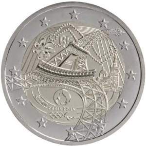 Beschrijving van het ontwerp: in de aanloop naar de Olympische Spelen van Parijs van 2024 brengt de Monnaie de Paris zowel de stad Parijs als het Franse erfgoed onder de aandacht. 100 jaar na de Spelen van 1924 organiseert de Franse hoofdstad opnieuw de zomerspelen. Dit is een evenement met internationale weerklank dat in 2024 gevierd wordt met twee aan de Olympische Spelen gewijde herdenkingsmunten van twee euro. Het ontwerp geeft Frankrijk weer met iconische gebouwen: de Eiffeltoren en de Notre-Dame de la Garde-basiliek in Marseille worden samen afgebeeld. Op de achtergrond staat een Tiare-bloem symbool voor het eiland Tahiti, waar de surfwedstrijden zullen plaatsvinden. De Eiffeltoren is in beweging en belichaamt zo de waarden van sport. De armen van de toren bestaan uit 73 klinknagels die de gastgemeenschappen vertegenwoordigen. Voor het eerst worden de Olympische en Paralympische symbolen samen afgebeeld om de Spelen voor iedereen te vieren. Op de atletiekbaan zijn het jaartal, de aanduiding van het land van uitgifte “RF” en de munttekens aangebracht. Langs de buitenrand van de munt zijn de twaalf sterren van de Europese vlag afgebeeld.