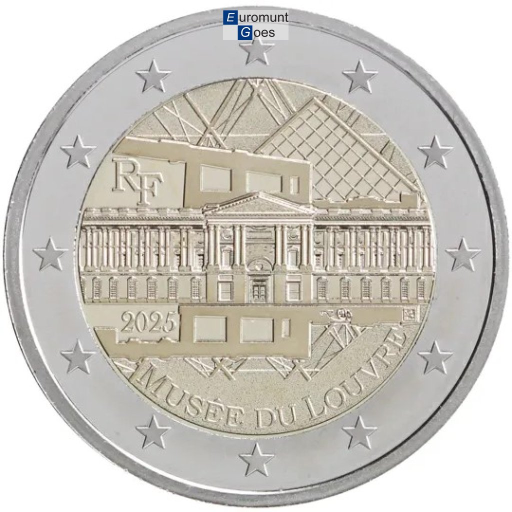 Beschrijving van het ontwerp: de afbeelding toont de oostelijke gevel van het Louvre die is versmolten met de iconische plattegrond van het museum waarop het labyrint van de buitengewone zalen te zien is. Op de achtergrond illustreren de piramidion en de structuur van de grote piramide het traditionele en eigentijdse karakter van het Louvre. Op de plattegrond van het museum zijn het jaar van uitgifte '2025', de aanduiding van het land van uitgifte 'RF' en de muntmerken aangebracht. Langs de buitenrand van de munt zijn de twaalf sterren van de Europese vlag afgebeeld.
