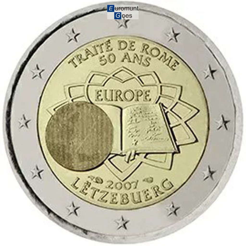 Beschrijving van het ontwerp: de munt toont het document met het Verdrag ondertekend door de zes oprichtingslanden tegen een achtergrond die herinnert aan de bestrating van de Piazza del Campidoglio in Rome (ontworpen door Michelangelo), waar het Verdrag op 25 maart 1957 werd ondertekend. De opschriften “Verdrag van Rome 50 jaar”, “EUROPA” en de naam van het uitgevende land zijn weergegeven in de respectieve talen van het eurogebied of in het Latijn. De opschriften verschillen dus van land tot land, maar de afbeelding is hetzelfde. Bij het Verdrag van Rome werd de Europese Economische Gemeenschap opgericht, wat uiteindelijk heeft geleid tot de invoering van de euro in 1999 en de eurobankbiljetten en euromunten in 2002. De verjaardag zal worden gevierd op 25 maart 2007. De landen van het eurogebied hebben de gelegenheid luister bijgezet door gezamenlijk deze herdenkingsmunt uit te geven. Het ontwerp is geselecteerd na een wedstrijd die door de Europese munthuizen is gehouden. Langs de buitenrand van de munt zijn de twaalf sterren van de Europese Unie afgebeeld.