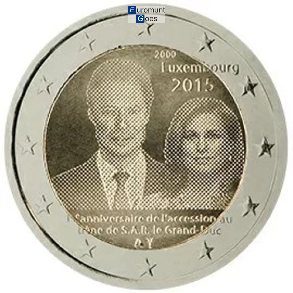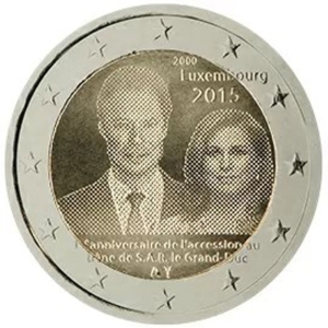 Beschrijving van het ontwerp: op de munt staan de koppen van HH. KK. HH. groothertog Henri en de groothertogin, met daarboven het jaar van de troonsbestijging „2000”, het land van uitgifte „Luxembourg” alsook het jaartal „2015”. Onderaan op de beeldenaar staat de inscriptie „15e anniversaire de l’accession au trône de S.A.R. le Grand-Duc”. Langs de buitenrand van de munt zijn de twaalf sterren van de Europese Unie afgebeeld.