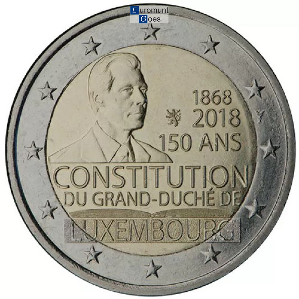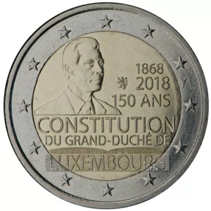 Beschrijving van het ontwerp: het ontwerp toont aan de linkerkant de beeltenis van Zijne Koninklijke Hoogheid groothertog Henri, naar rechts kijkend. Aan de rechterkant van het ontwerp staan de jaartallen "1868-2018" en de tekst "150 ans" ("150 jaar"). Onder de beeltenis van de Groothertog staan de tekst "Constitution du Grand-Duché de Luxembourg" ("Grondwet van het groothertogdom Luxemburg") en een doorsnede van een openliggend boek. Langs de buitenrand van de munt zijn de twaalf sterren van de Europese Unie afgebeeld.