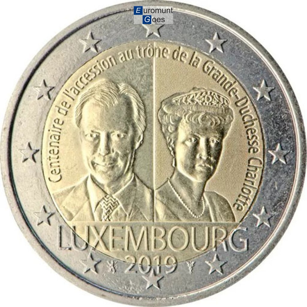 Beschrijving van het ontwerp: de munt toont links de beeltenis van Zijne Koninklijke Hoogheid groothertog Henri, en rechts de beeltenis van groothertogin Charlotte. Aan de onderzijde staan de naam van het uitgevende land “LUXEMBOURG” en het jaar van uitgifte “2019”. Bovenaan, in een halve cirkel rond de beeltenissen, staat de inscriptie “Centenaire de l’accession au trône de la Grande-Duchesse Charlotte” (100e verjaardag van de troonsbestijging van groothertogin Charlotte). Langs de buitenrand van de munt staan de twaalf sterren van de Europese Unie afgebeeld.