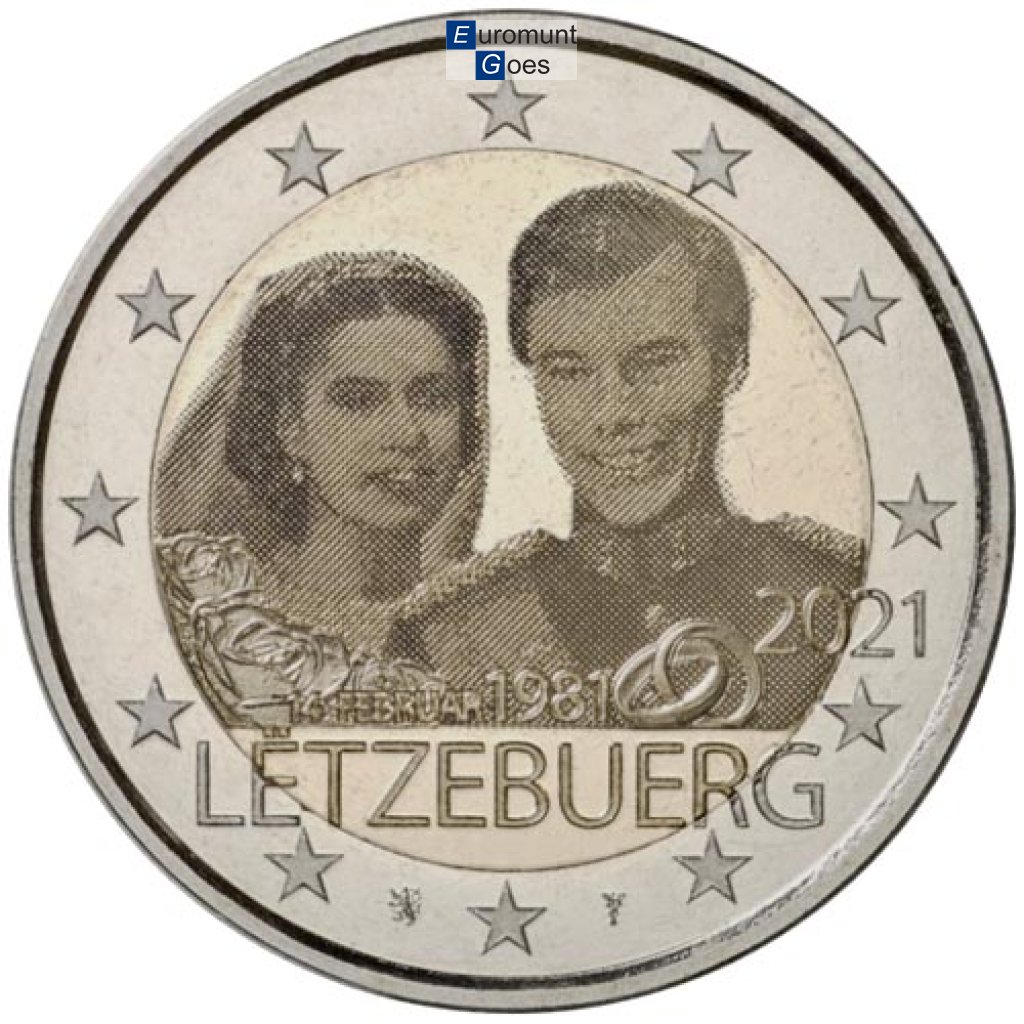 Beschrijving van het ontwerp: het ontwerp toont de beeltenissen van groothertog Henri en groothertogin Maria Teresa. Onder de beeltenissen zijn twee trouwringen te zien, voorafgegaan door de trouwdatum “14. FEBRUAR 1981” en gevolgd door het jaartal “2021”. Het woord “LËTZEBUERG”, waarmee het land van uitgifte wordt aangeduid, bevindt zich onderaan. Langs de buitenrand van de munt zijn de twaalf sterren van de Europese vlag afgebeeld.