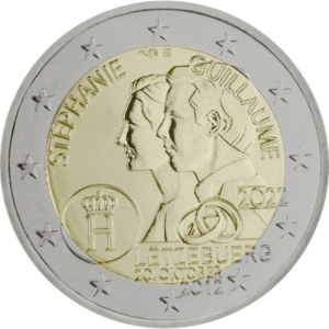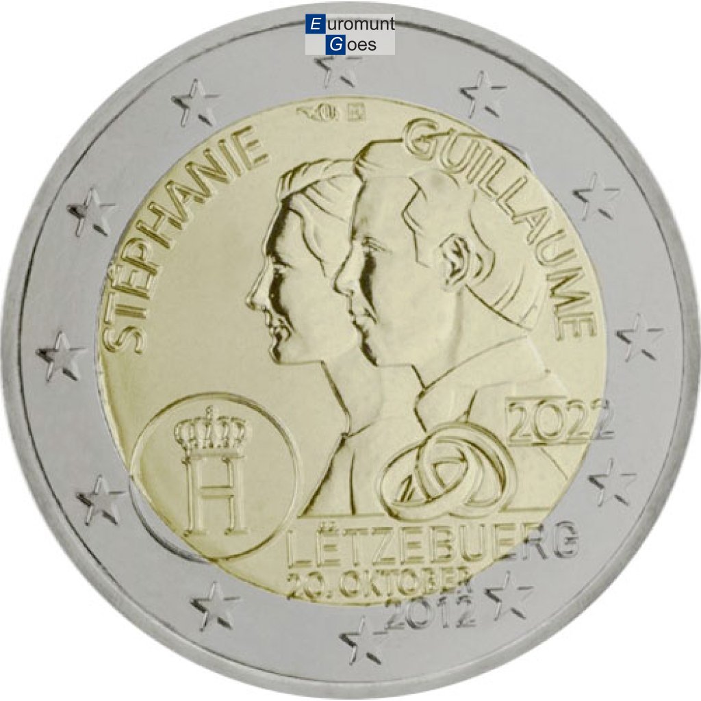 Beschrijving van het ontwerp: op de munt zijn de beeltenissen van erfgroothertog Guillaume en erfgroothertogin Stéphanie weergegeven. Daarboven staan hun namen in een halve cirkel. Links van het jaar 2022 zijn twee trouwringen afgebeeld. Onderaan het ontwerp staat het woord “LËTZEBUERG”, waarmee het land van uitgifte wordt aangeduid, alsook de huwelijksdatum “20. Oktober 2012”. Het monogram (de letter ‘H’ met een kroon) staat voor groothertog Henri. Langs de buitenrand van de munt zijn de twaalf sterren van de Europese vlag afgebeeld.