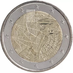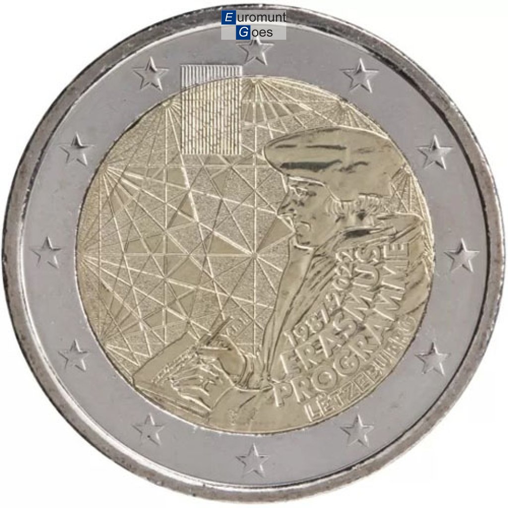 Beschrijving van het ontwerp: een combinatie van twee belangrijke elementen van het Erasmus-programma: de geestelijk vader, Erasmus zelf, en een allegorie van zijn invloed op Europa. Voor het eerste element staat een van de bekendste afbeeldingen van Erasmus symbool. Het tweede wordt gesymboliseerd door bakens die stralen naar elkaar zenden die als een netwerk over de munt liggen. Daarmee worden de talrijke intellectuele en menselijke uitwisselingen tussen de Europese studenten verbeeld. Sommige verbindingen vormen sterren, voortkomend uit de synergie tussen landen, als verwijzing naar Europa. Het getal 35, als weergave voor het 35-jarige bestaan van het Erasmus-programma, komt in een hedendaagse grafische stijl uit de sterren naar voren. Langs de buitenrand zijn de twaalf sterren van de Europese vlag afgebeeld.