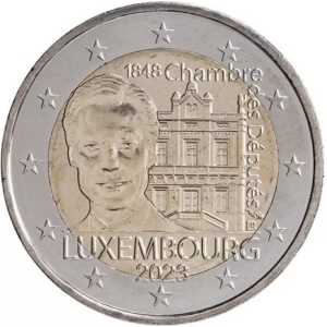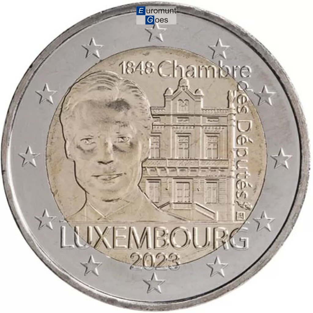 Beschrijving van het ontwerp: links staat de beeltenis van Groothertog Henri en rechts het gebouw van de Kamer van Afgevaardigden. Rechtsboven het gebouw staan het jaartal “1848” en de tekst “Chambre des députés” (Kamer van Afgevaardigden). Onderaan in het midden zijn de naam van het uitgevende land “LUXEMBOURG” en het jaar van uitgifte “2023” vermeld. Langs de buitenrand van de munt zijn de twaalf sterren van de Europese vlag afgebeeld.