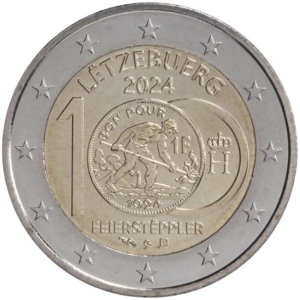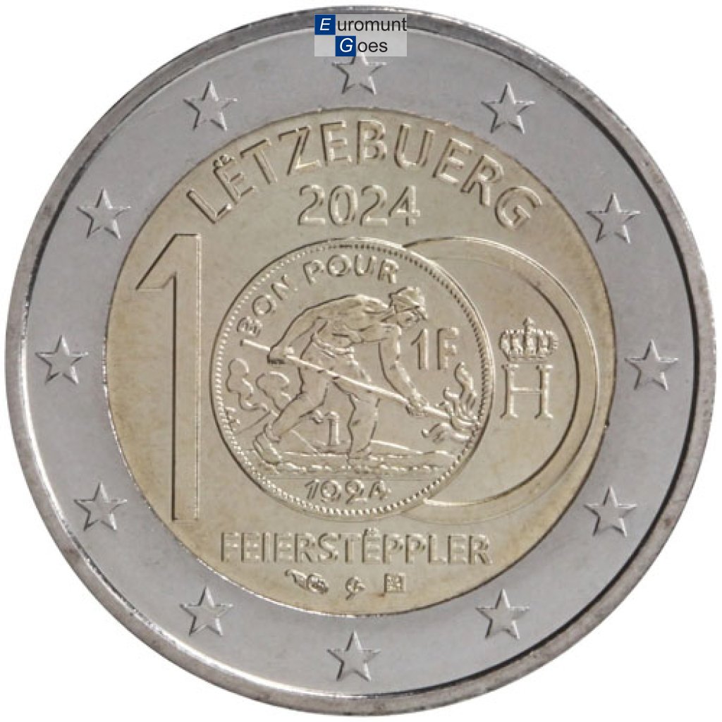 Beschrijving van het ontwerp: in het midden van het ontwerp staat het Luxemburgse muntje van 1924 waarop een handarbeider in de staalindustrie afgebeeld is. Deze afbeelding maakt deel uit van het cijfer “100” om de verjaardag van de eerste afgifte van de Luxemburgse frank die het langst circuleerde te vieren. De naam van het land van uitgifte LÉTZEBUERG en het jaar van uitgifte 2024 staan bovenaan. Onderaan staat het woord "FEIERSTËPPLER", de gangbare benaming voor deze munt. Het monogram (letter “H” met een kroon) staat voor de groothertog Henri. Aangezien het land van herkomst van de Munt nog niet bekend is, zou de tijdelijke aanduiding van het muntmerk vervangen kunnen worden. Langs de buitenrand van de munt zijn de twaalf sterren van de Europese vlag afgebeeld.