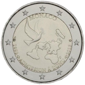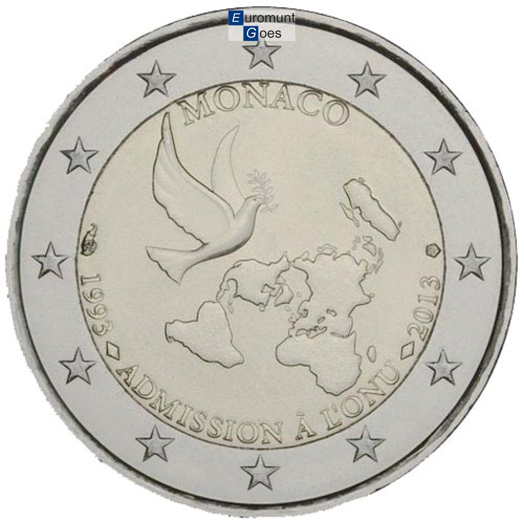 Beschrijving van het ontwerp: Op de munt is een duif met een olijftakje afgebeeld, met in het midden van de boog links de hoorn des overvloeds en rechts het stempel van de Parijse Munt. Aan de bovenzijde in een halve cirkel de naam van de uitgevende staat „MONACO” en aan de onderzijde in een halve cirkel de inscriptie „1993 ADMISSION À L'ONU 2013”. Langs de buitenrand van de munt zijn de twaalf sterren van de Europese Unie afgebeeld.
