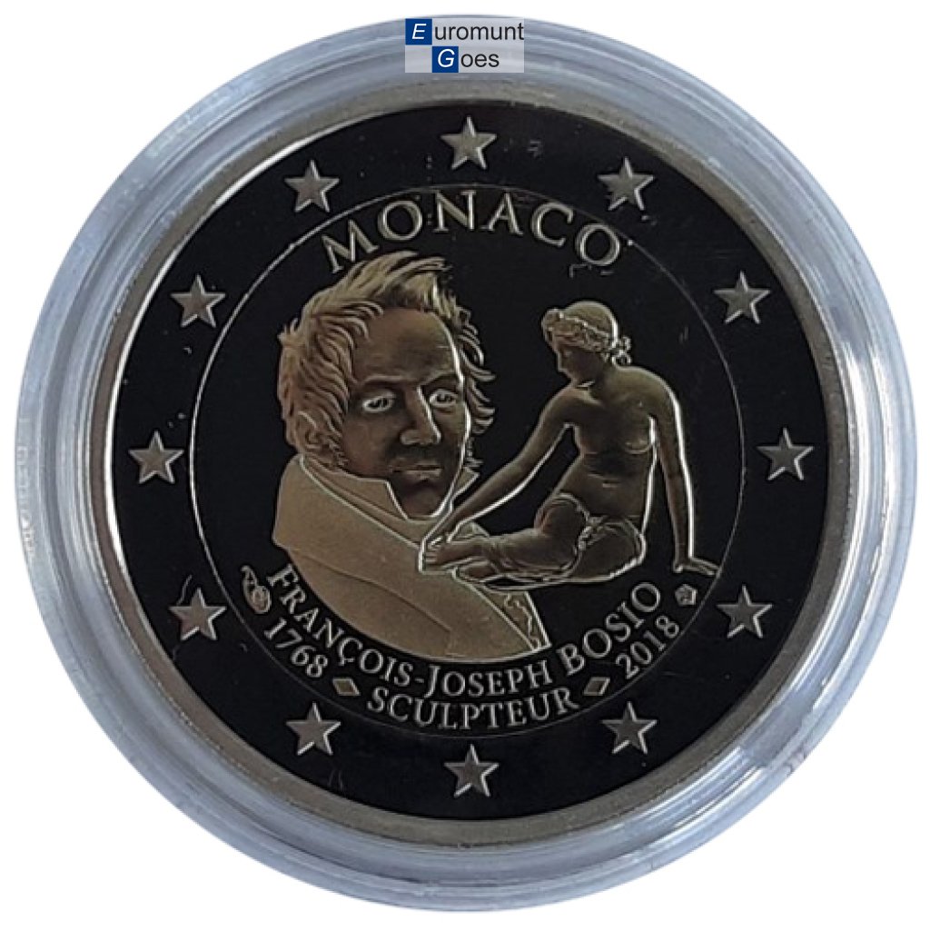 Beschrijving van het ontwerp: op de munt is François-Joseph Bosio afgebeeld met een standbeeld op de achtergrond. Boven aan de afbeelding staat in een halve cirkel de inscriptie “MONACO”. Onderaan staan, eveneens in een halve cirkel, twee inscripties: “FRANÇOIS-JOSEPH BOSIO” en daaronder “1768 – SCULPTEUR – 2018”. Aan de linker- en rechterzijde van deze twee inscripties staan het muntteken en het muntmeesterteken. Langs de buitenrand van de munt zijn de twaalf sterren van de Europese Unie afgebeeld.