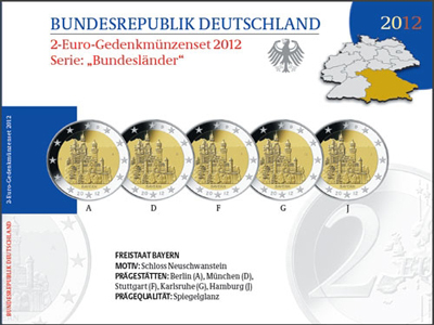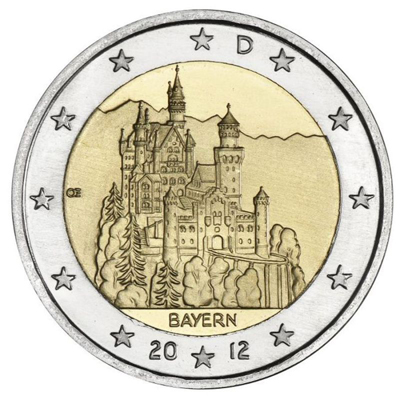 Beschrijving van het ontwerp:Op het binnenste gedeelte van de door Erich Ott ontworpen munt is het oostaanzicht te zien van slot Neuschwanstein, een van de beroemdste historische monumenten van Beieren, met op de voorgrond het poortgebouw, de romantische torens en torentjes van het slot zelf en daarachter de majestueuze bergen. Daaronder staat de naam van de deelstaat: BAYERN. Rechts staat het muntteken van het huis waar de munt is geslagen (A, D, F, G of J), links de initialen van de ontwerper. Langs de buitenrand van de munt zijn de twaalf sterren van de Europese Unie afgebeeld, met bovenaan een D en onderaan 2012 voor respectievelijk het land en jaar van uitgifte.